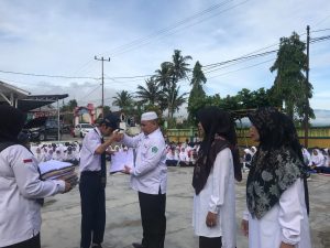 Kepala madrasah memberikan baju pertama kepada siswa putra di lanjutkan kaur TU Akriyanti, waka kurikulum Reni Adriani, waka sarpras Riza Forina, waka humas Hutri wanti, guru senior Mahyulis, Ratna Juita, Sefri Melliza, Toto Rikardi dan Getri Indra Piola.