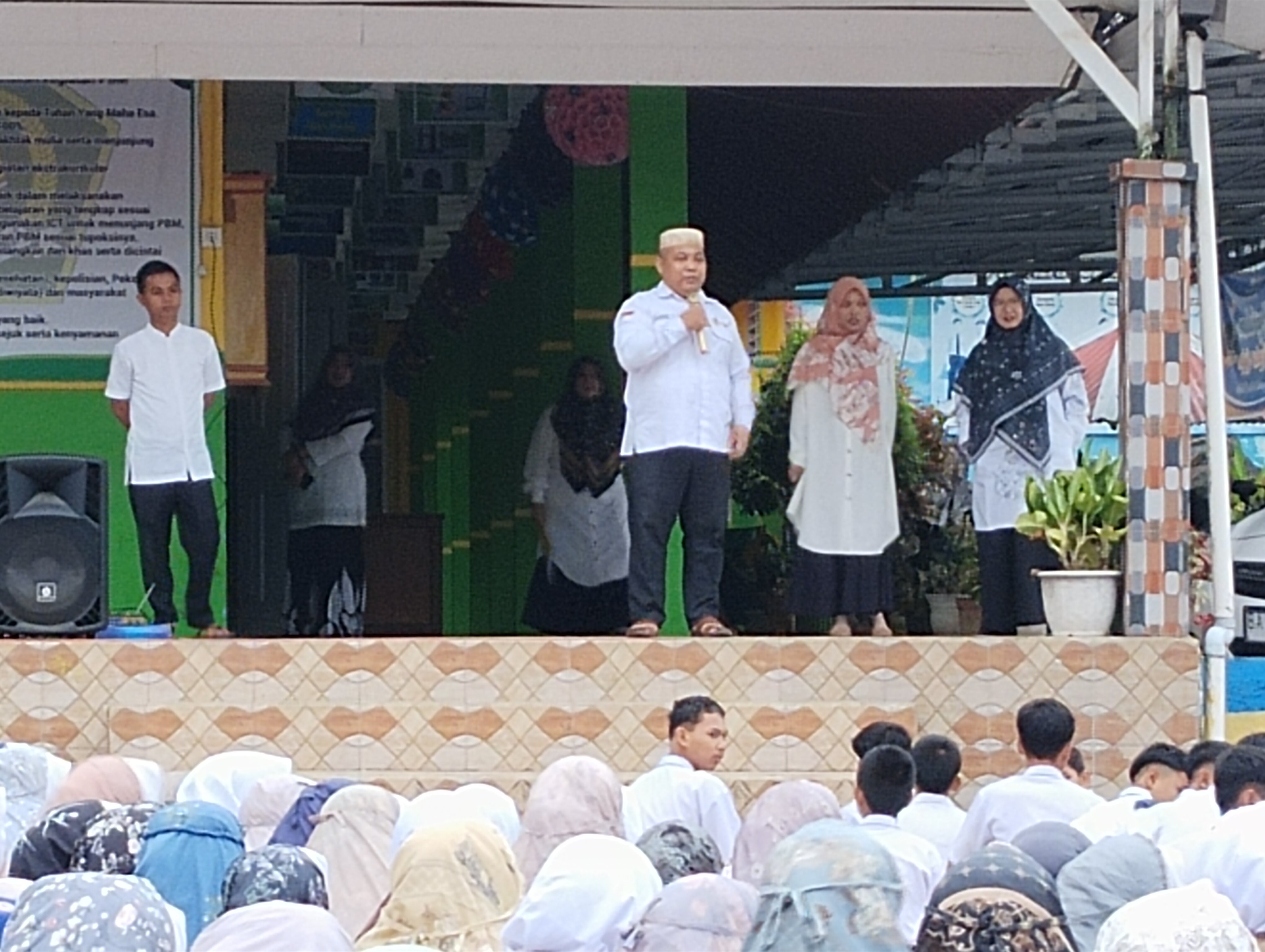 Pekan Selasa, Humas — Kepala MTsN 3 Solok Selatan H. Jasrul memberikan nasehat kepada seluruh siswa MTsN 3 Solok Selatan setelah pelaksanaan shalat dhuha, zikir dan doa dipimpin guru Fiqih Mahyulis di lapangan madrasah, Selasa 7/10/2025.
